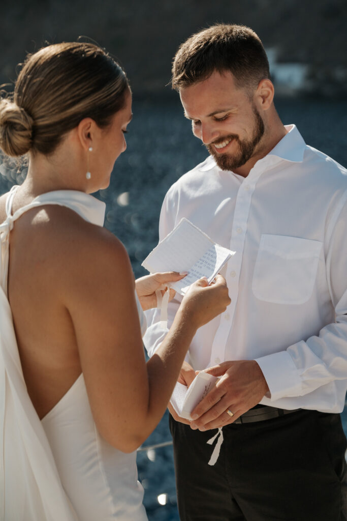 It’s not just a ceremony. It’s exploring with your Santorini local photographer (aka me!) the island from the first light at the cliffs of Oia, exchanging vows somewhere quiet and ending the day sailing in golden light.
