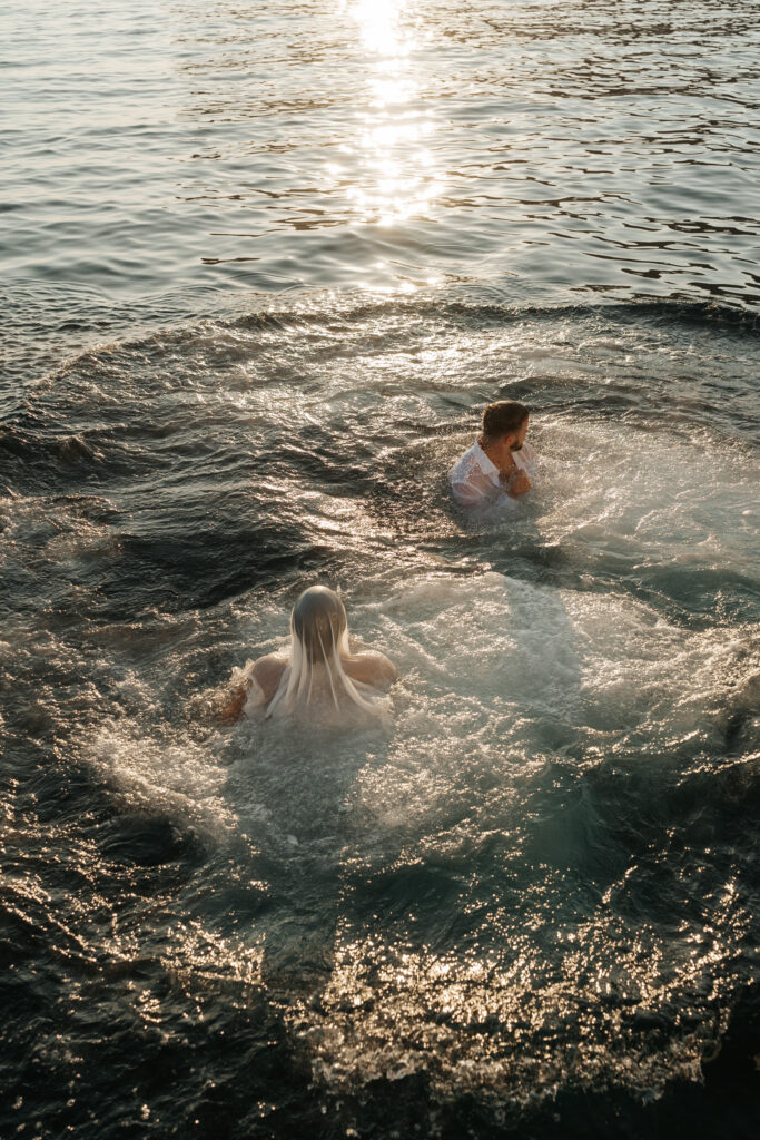 When everything slow down and the magic golden light of Santorini touches the water, the experience becomes even more unique. You could jump into the sea in your wedding outfits (or change into swimwear or another outfit) and stay barefoot while enjoying the unforgettable sunset of this island.